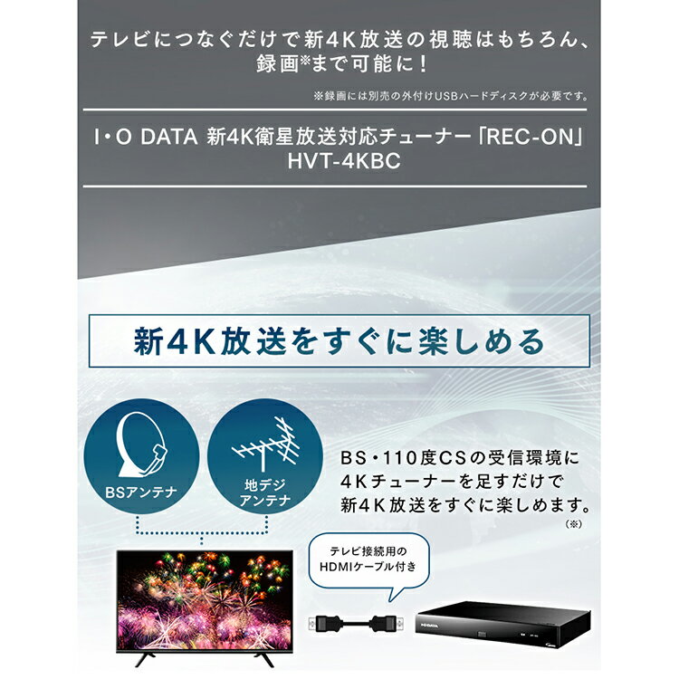 【4Kチューナー HVT-4KBC】●型番HVT-4KBC●商品サイズ(cm)幅約22.0×奥行約15.0×高さ約3.5●質量約600g●消費電力約18W●受信放送種類新4K衛星放送●搭載チューナー高度BS/110度CS×1●HDMI端子×1●USB端子×1(録画用USB HDD接続用)●LAN端子×1●マルチメディアサービス〇(データ放送)●HDR対応〇●4K→2Kコンバート〇●再生トリックプレイ早送り/早戻し/30秒送り/10秒戻しなど(検索用:4K対応 地デジ BS CS テレビ 液晶テレビ ) 当店おすすめ特集★